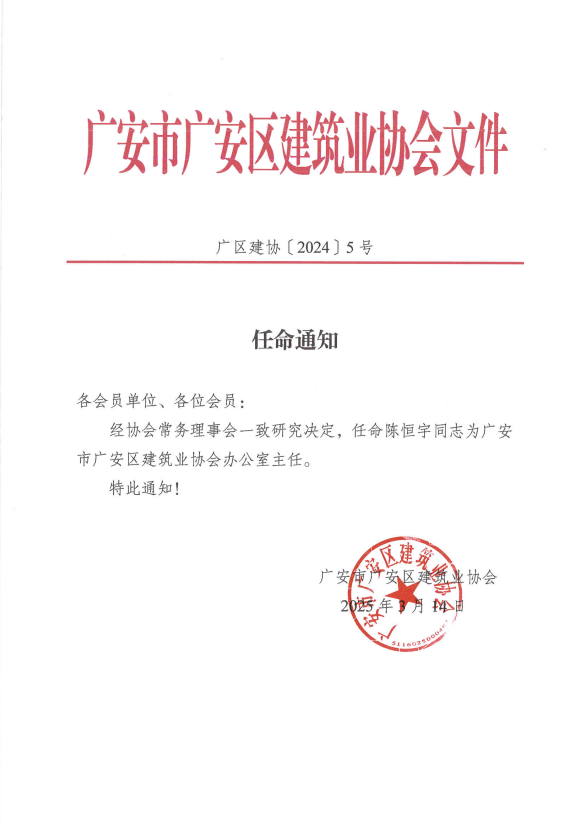 经协会常务理事会一致研究决定,任命陈恒宇同志为广安市广安区建筑业协会办公室主任。